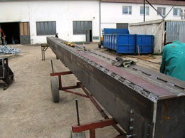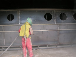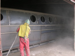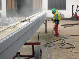 Tryskanie oceľovej konštrukcie, fy. Fermont. Z dôvodu prevozu si zákazník zvolil otryskanie priamo v jeho priestoroch.