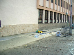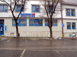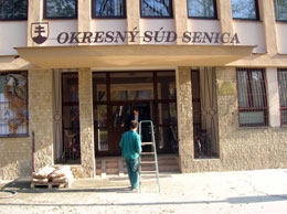 Tryskanie sokla budovy Okresného súdu v Senici. Tu muselo byť zvolené nízkotlaké tryskanie nakoľko sokel má remienkovú skladbu. Iné spôsoby tryskanie by boli nevhodné.