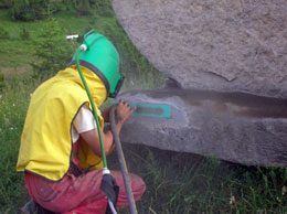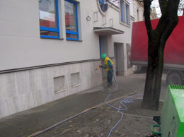 Odstraňovanie grafitov zo stien budov a fasád. Čistenie zašlých kultúrnych pamiatok za pomoci vody a abrazíva. Jemné tryskanie bez poškodenia malích detailov (oči,nos jemné detaili).