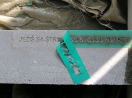 Krížová cesta na vrch Oravcové v Terchovej. Tryskanie nápisov cez fóliu, tryskanie prebehlo aj na samotnom vrchu Oravcové. Kde boli použité ekologické certifikované abrazíva.