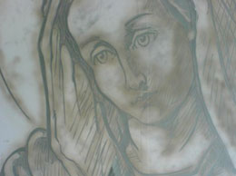 Pieskovanie skla (obrazov) po zlepení fólie sa objaví vypieskovaný vzor na skle. Tento vzor je de facto nezničiteľný.