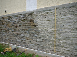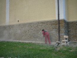 Tryskanie kamenného sokla. Sokel bol predtým omietnutý nakoľko omietka v sebe držala vlhkosť a tá sa odstránila ručne. Pieskovaním sa potom priznal prírodný kameň ktorý bol pod ňou.